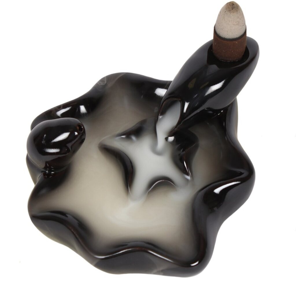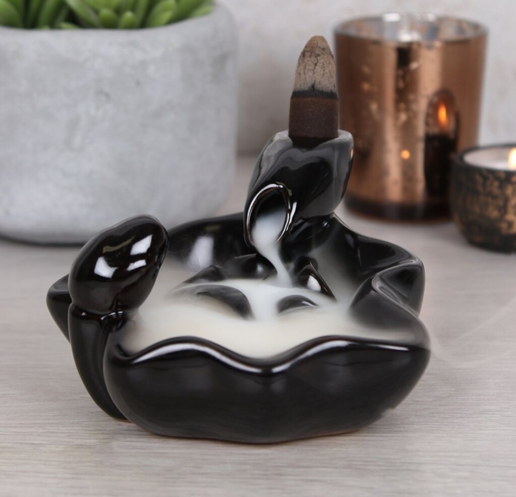 A simple yet beautiful backflow incense burner in a black ceramic lotus pool design. When the cone is lit the smoke from the cone cascades downwards in a mesmerising waterfall effect to pool at the bottom. Beautiful to watch. For best effects burn indoors in an area away from any sudden air movements. Please note that after burning it is normal for a light oily residue to appear on the oil burner, for this reason we recommend protecting any furniture it is placed upon suitably. The residue can be easily wiped off the burner with a damp cloth. Please exercise caution when burning incense. Only backflow incense cones should be used with this product – standard incense cones will not create the desired effect. It is normal for cones to take up to 10 minutes after being lit to start creating the smoking/mist effect. We supply a selection of backflow incense cones in a variety of scents.