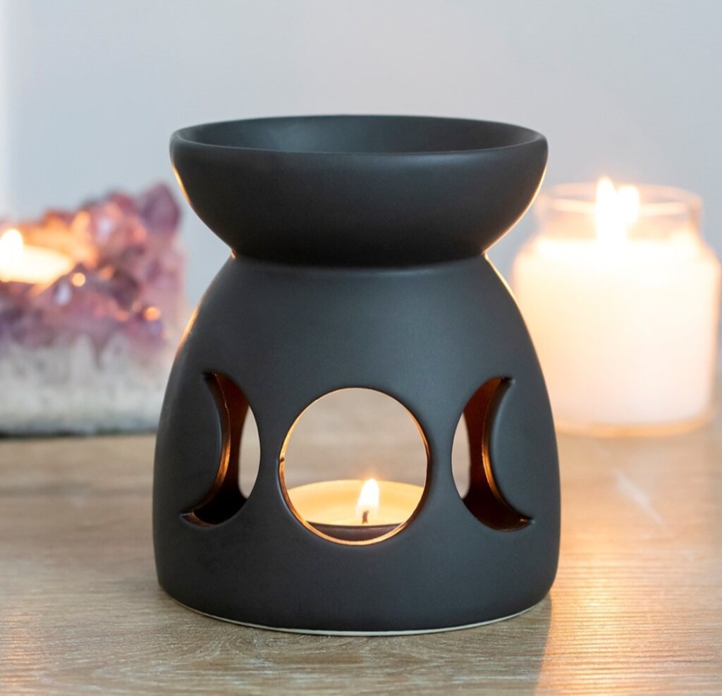 This black ceramic oil burner features a cutout triple moon design and a cool, matt finish. Compatible with both fragrance oil and wax and perfect for Halloween or spooky decor! Designed by Something Different Wholesale.
